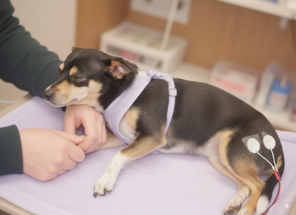 c) IONOFORESE, ideal para a veiculação de fármacos.A sessão dura em media 10-20 minutos e se desenvolve com o animal em decúbito lateral, com a tosa do pêlo na região a ser tratada, aplicação de gel e sucessivamente dos eletrodos à pele.